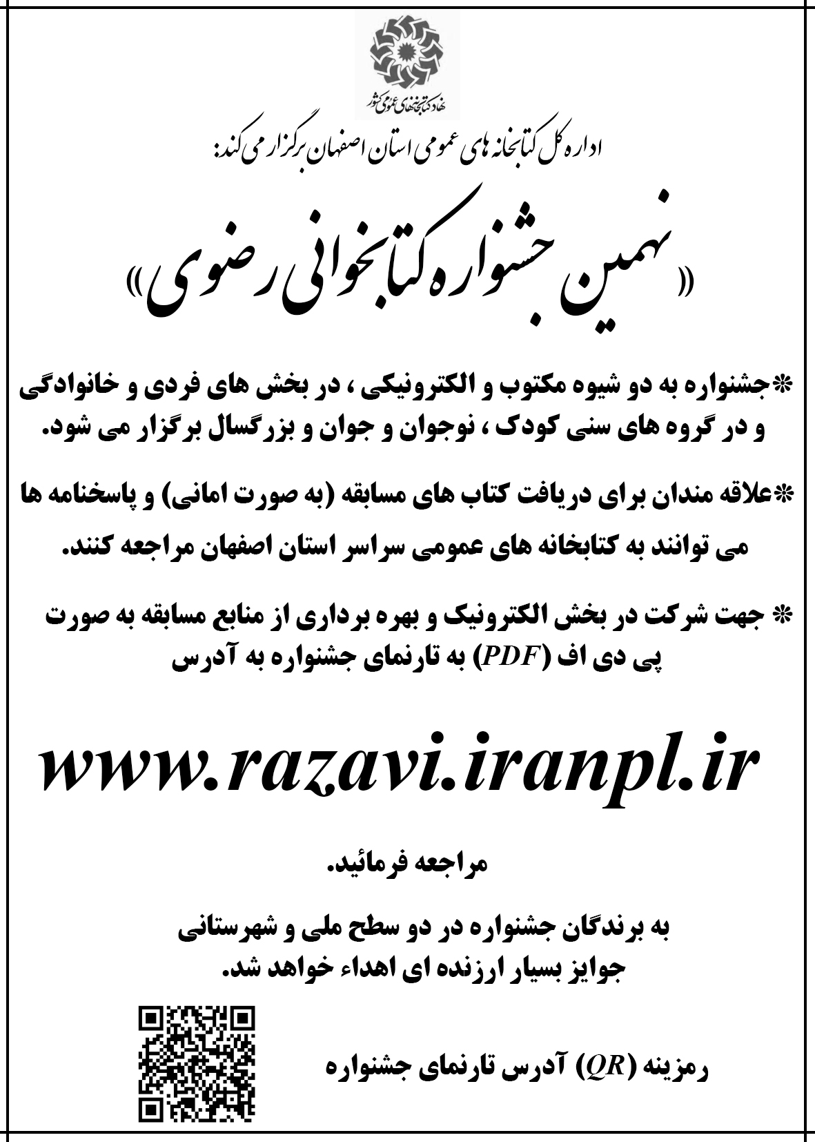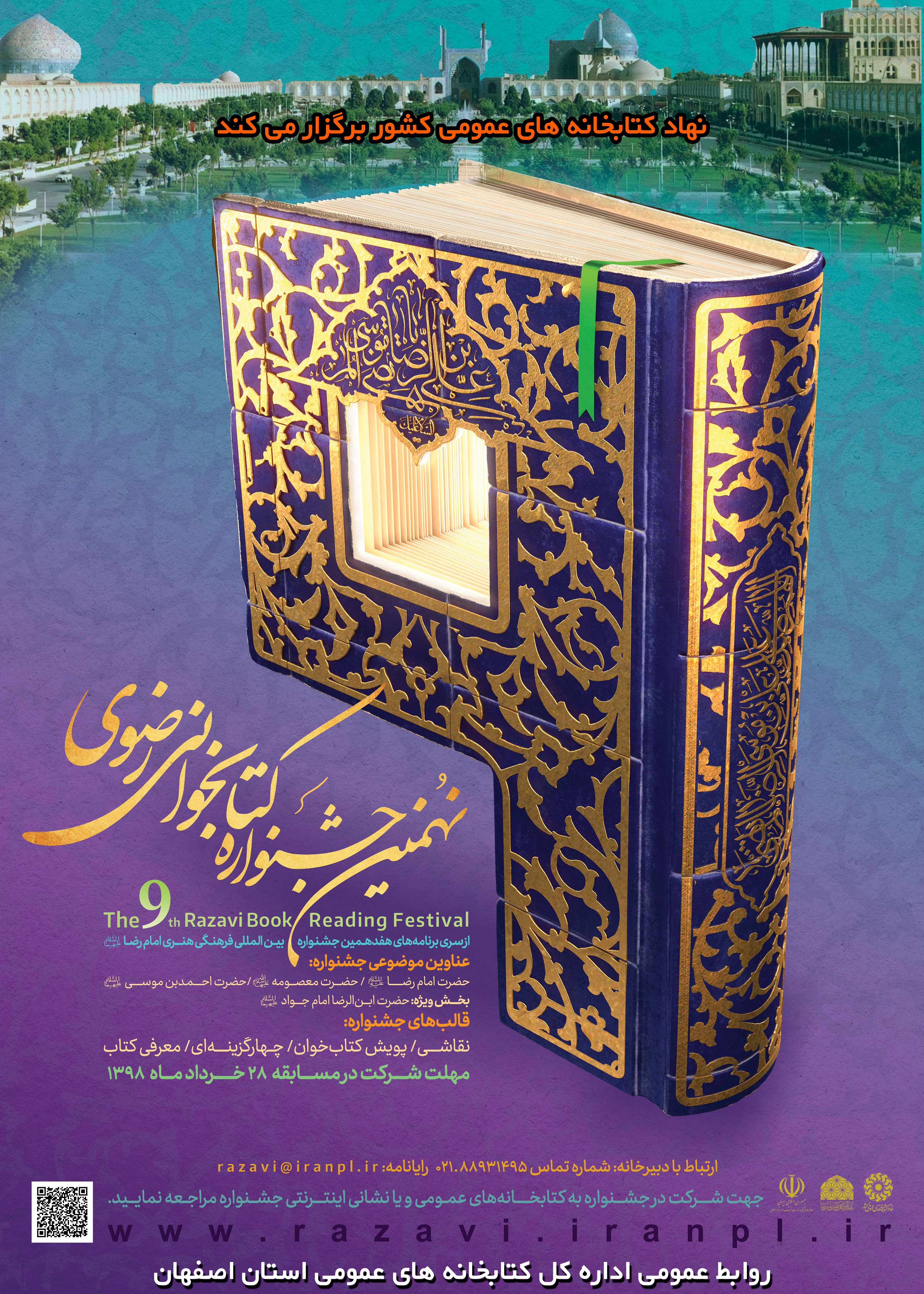 پوستر نهمین جشنواره کتابخوانی رضوی توسط نهاد کتابخانه های عمومی کشور با هدف اطلاع رسانی این جشنواره و استفاده در کتابخانه ها، اماکن عمومی و فضاهای شهری در سطح کشور منتشر شد.